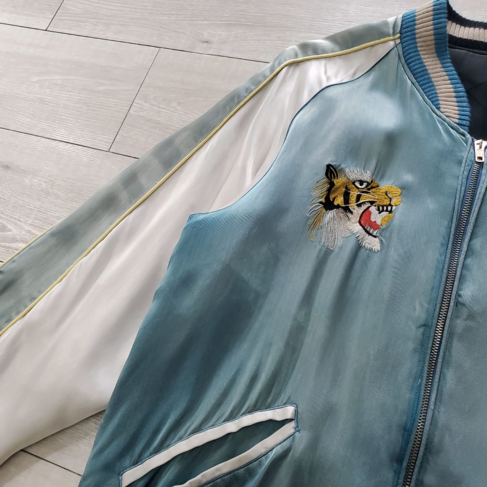 1990 s 抜群のフェード感 レーヨン サテン 虎×キルティング リバーシブル スカジャン M相当 1950-60 s復刻品 ヴィンテージ 刺繍 スーベニアジャケット 古着 アメカジ 横須賀