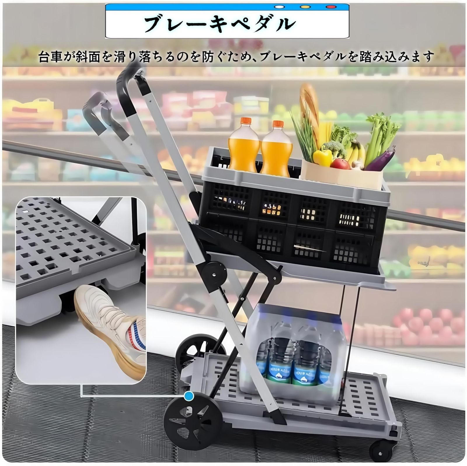 ??【大容量と高耐荷重】2段構造になっており、カートきで90kgまで積載可能、下段は50kg、上段は40kgまでの重さに耐える。外寸は98×62×112cmで 、重量は12kgと。 ピッタリ収まる折り畳みコンテナ付き、大量の荷物を容易に運ぶことができます、台車以上の積載能力、日常の買い物カートや搬送ニーズに対応。作業効率を向上できる。