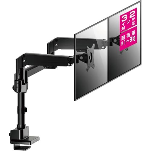 デュアルモニター環境を構築できる2アームモデル。17-32インチ対応、耐荷重1-9kg。モニターアームでデスク広々、スタンドがなくなり空いたスペースを有効活用できます。