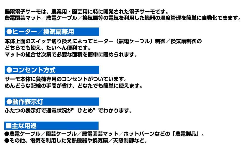 主な用途:農電ケーブル/園芸ケーブル/農電園芸マット/ホットバーンなどの「農電製品」。・その他、電気を利用した発熱機器や換気扇/天窓制御など。