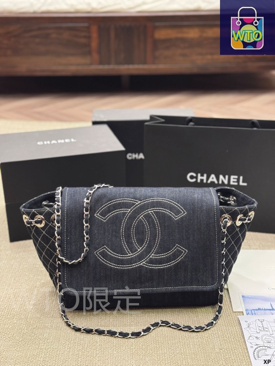 CHANELのデニムトートバッグ。アンティーク加工のデニム地と上品なシルエットが特徴です。使いやすいサイズ(縦25cm × 横30cm)で、普段使いからお出かけまで活躍します。シンプルなコーデでもおしゃれ度がアップする一品です。