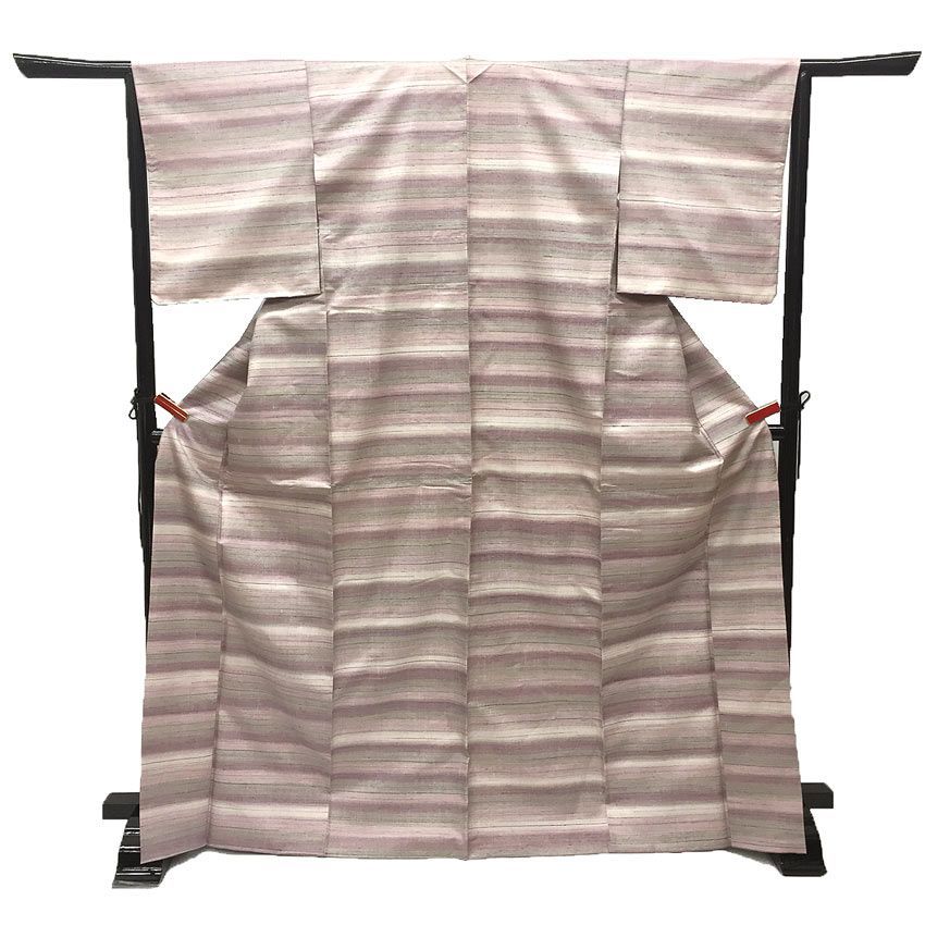 上品な草木染ならではの優しい京藤色の濃淡に、錆浅葱色や黄緑色など多色の色糸を横段に表したモダンなつむぎの着物です。