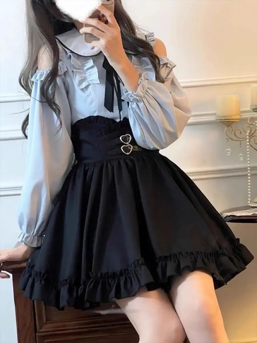 ベイビー ネック オフショルダー 長袖 シャツ トップ レイヤード スカート レディース セットアップ