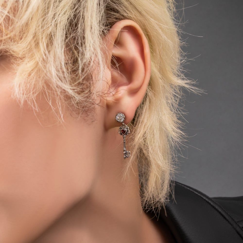 Named for Freyja, Norse goddess of love and beauty, this romantic drop earring pairs old-world detail with modern poise. A crown-inspired stud holds a brilliant clear cubic zirconia, from which a finely pierced key motif sways. At its heart: a vivid, heart-shaped garnet—a deep red spark that symbolizes love, possibility, and good fortune. The sculpted silverwork is rich with relief and shadow, giving the piece an elegant presence that frames the face without overwhelming it. Crafted in sterling silver and finished by skilled artisans at our partner atelier, it’s more than jewelry: a small, wearable work of art for every day.