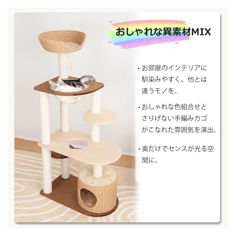 キャットタワー 据え置き おしゃれ 大型 高さ142cm 大型猫 シニア猫 木製ボードにベルベット張り 手編みカゴ ラタン風 壁際ぴったり コーナー コンパクト 成猫 省スペース 上下しやすい インテリア性 多頭飼い スリム 夏冬兼用 見晴台 猫タワー 宇宙船 クリアボウル 中型猫 爪研ぎ ハンモック 重厚感 コットン紐 隠れ家 安定 運動不足解消 猫ベッド ストレス発散
