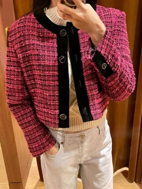 このツイードジャケットはホットピンク色で、黒いラインが入っています。丈もクロップドなので、使い勝手も抜群です。