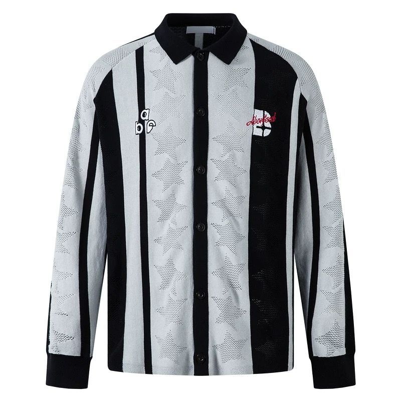 ・デザイン:レタリング刺繍/配色切り替え/翻領(ターンダウンカラー)/透かし編み