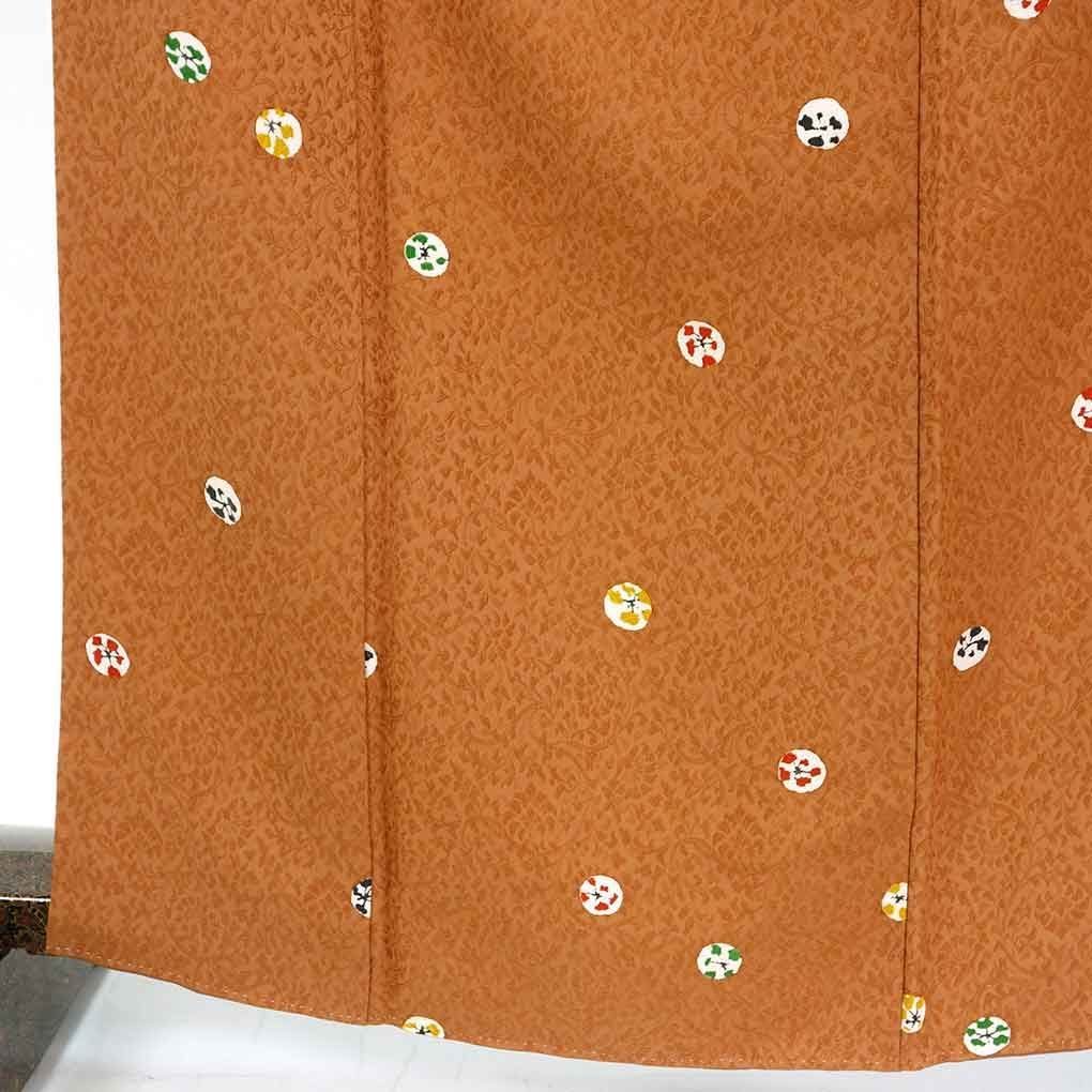 正絹のちりめん地の袷小紋着物です。オレンジかかった茶色地に丸の中に梅(?)を描いたような柄でカジュアル用途にお召しいただけます。身長158cm-168cm程度、標準体型からややふくよかな方にお勧めサイズです。広衿仕立て。裄の縫い代は7cm程度ありそうです。
