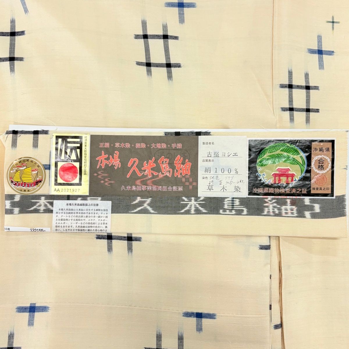 紬 身丈173.5 cm 裄丈67 M 袷 久米島紬 草木染 証紙 井桁絣 絣柄 クリーム 正絹