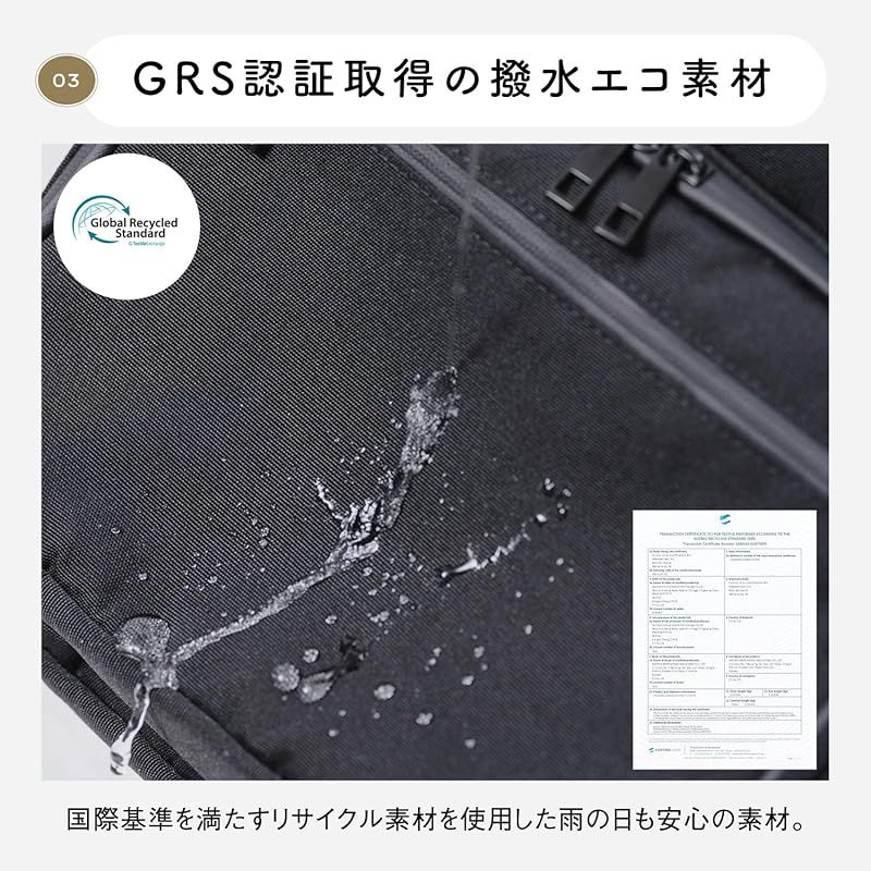 ?【耐久性も抜群の環境に優しいエコ素材】素材は500mlペットボトル15.84本分を再生利用したリサイクルポリエステル(R-PET)素材を使用。 雨や水汚れの水分をはじく撥水加工なので、お出かけ・買い物、長期旅行・イベントなどにもぴったりな万能マザーズリュック。 抗菌加工も施しているので、食べ物汚れなどにも強い。 素材の厚みはアウトドアバッグでも使わえれる高密度900Dを採用し耐久性を高めました。 リサイクル品質をするGRS国際認証を取得。