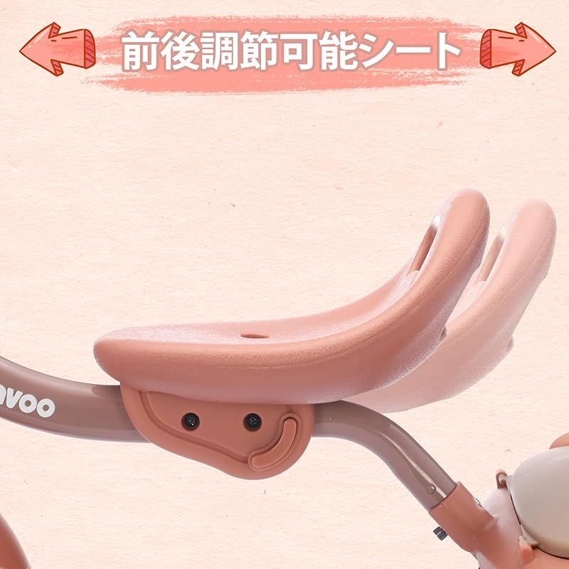 ?【調節可能】三輪車のサドルシートは前後に調節ができます、お子様の成長に伴って、身長が伸びてもずっと使えます。それぞれの身長の赤ちゃんに合うようにできますよ。
