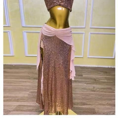 ベリーダンス オリエンタル衣装 トップス スカート オーダーメイド ステージ衣装 スパンコールセットアップ ピンク