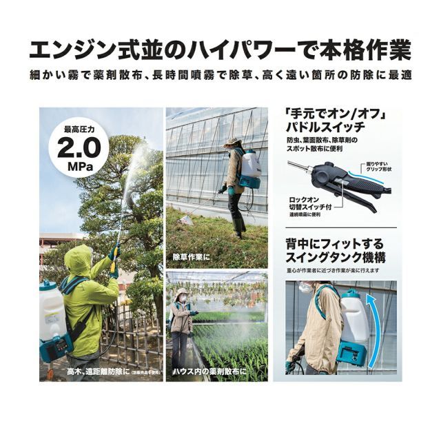 高木や遠距離の防除、長時間の除草作業、ハウス内の薬剤散布等に最適です。