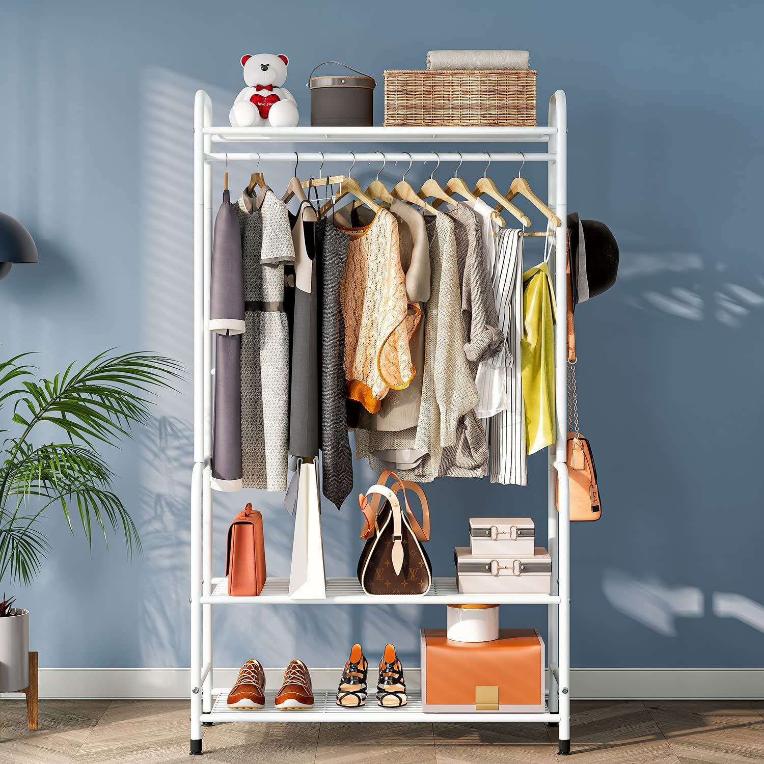 【省スペースにスッキリ収納】:衣類をかけるだけでなく、置くスペースも充実しています。スーツやコート.ワンピースなどの長い洋服が収納可能!置き棚は2ヶ所もあり、服以外はバッグ、マフラー、靴、毛布などのファッション小物の収納にも便利です。 さらに4つのフック付きなので、ジャケット、シャツ、傘、帽子やカバンなどのファッション小物の収納にご活用いただけます。