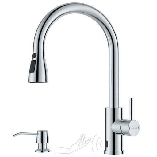 DAYONEタッチレス水栓クロム ソープディスペンサーSUS 304ステンレス赤外線センサー自動水栓360°回転50 CM引き出し式混合栓3つの吐水モード非接触式キッチン蛇口日本規格G 1 2’’コネクター日