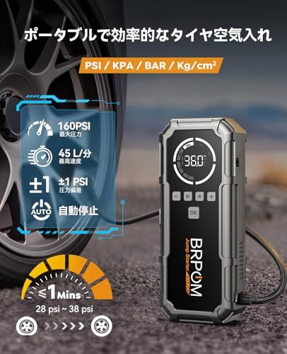BRPOM ジャンプスターター 空気入れ 8000 A 160 PSIエアコンプレッサー搭載 すべてのガソリン車 12 0 Lディーゼル車対応 自転車 バイク 車対応 機能 LEDライト USB急速充電 pse認証登録済 m