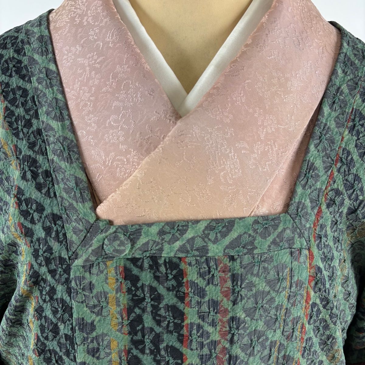 道行 身丈131 cm 裄丈65 M 和装コート 紬地 縞 幾何学模様 絞り 灰緑 正絹
