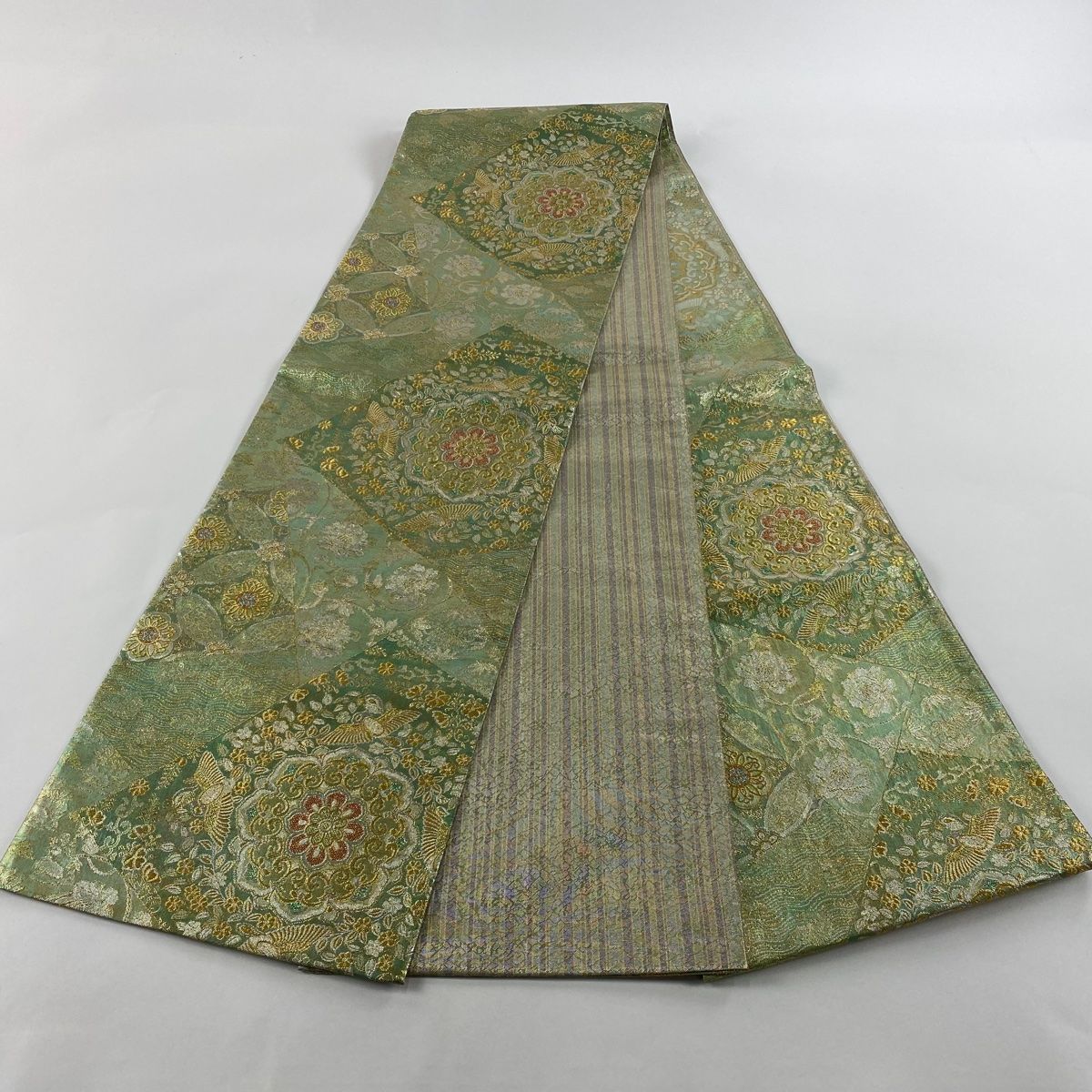 袋帯 秀品 裂取瑞鳥花文 金銀糸 箔 薄緑 六通 正絹