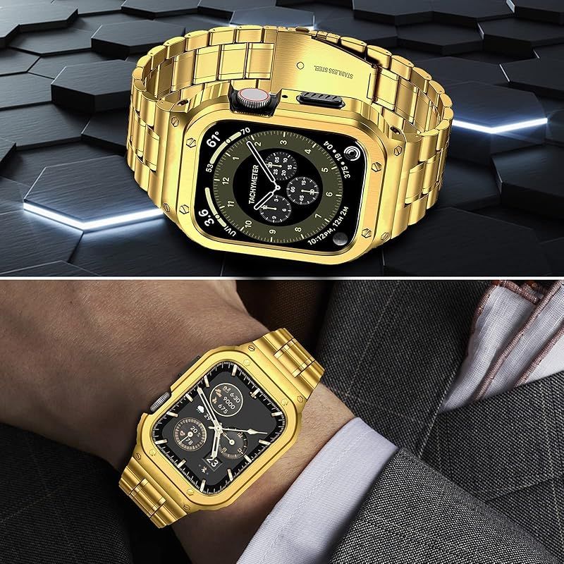 商品名:MioHHR ステンレススティール製バンド、ケース互換性 Apple Watch Bands 42mm,金属製保護バンパーカバー付き頑丈なストラップ iWatch シリーズ 10/11 男性用 (ゴールド)