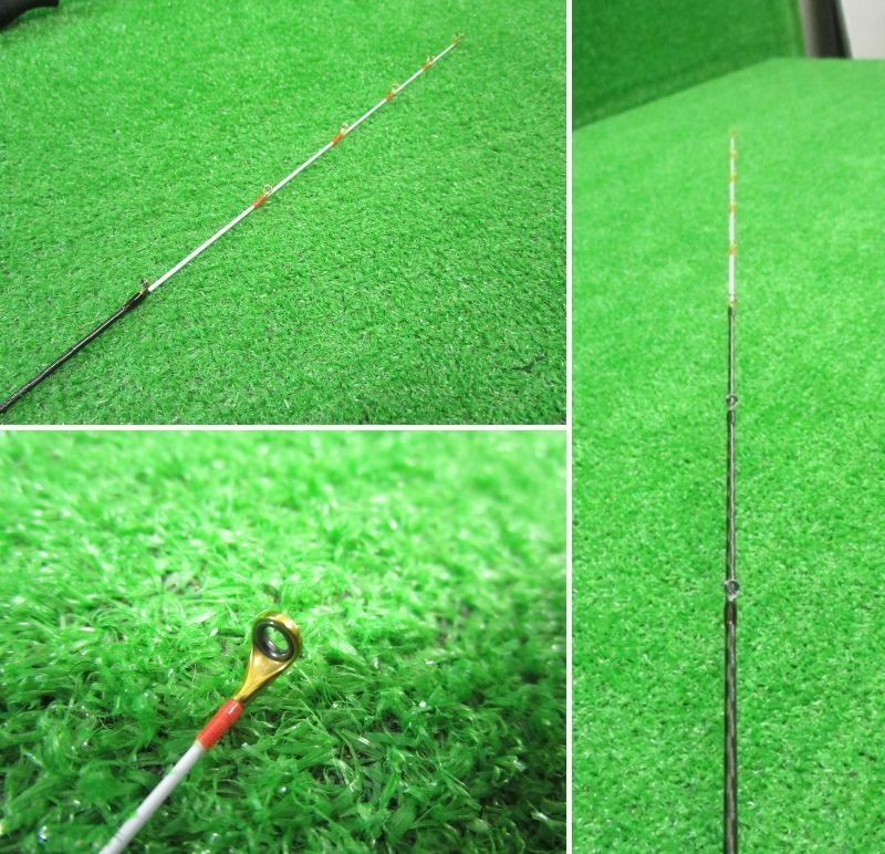 EVAグリップにテカリ・リヤグリップにキズ・トリガー部にキズ・リールシート周辺にも使用感が見られ、ブランクスには写真の様なキズも見られます。また8番11番ガイド付け根に写真の様なエポギシ割れや若干のガイド起きも見られる新品商品です。