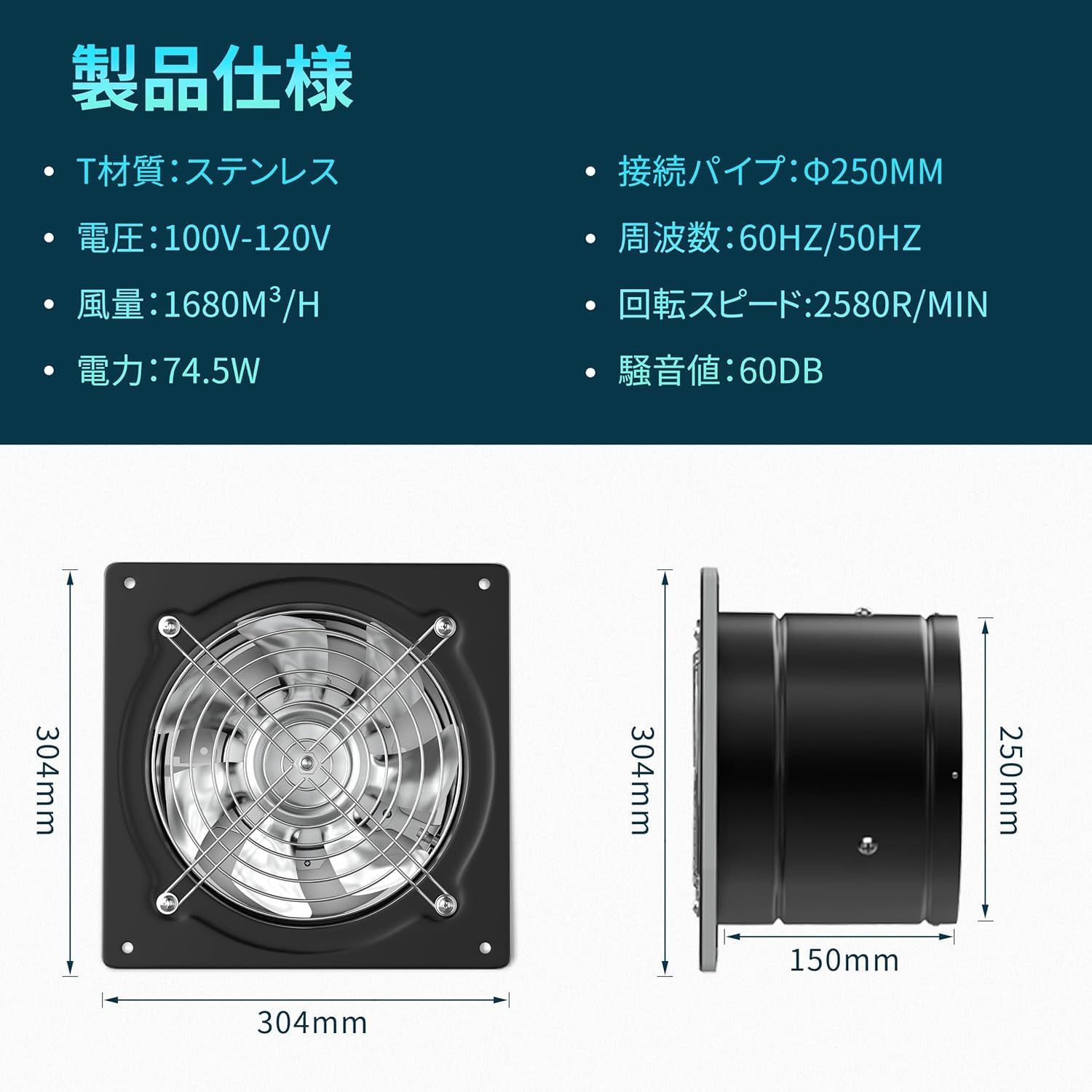 【金属製換気扇&スイッチ付き】最新型換気扇:スイッチ付き、換気扇直径:10inch/250mm、風量:1680m3/h、色:黒、消費電力:74.5W、回転スピード:2580r/min、騒音値:60dB、電圧:100v-120v、周波数:50Hz/60Hz、コンセント:3ピン。塗装工事、キッチン、倉庫、大空間換気の場合はおすすめ。