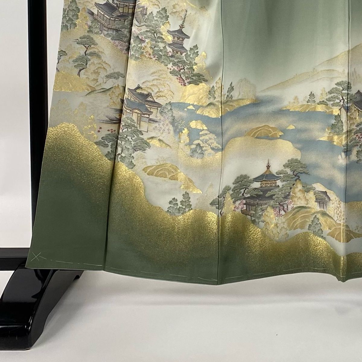 色留袖 身丈160 cm 裄丈64 M 袷 袋帯セット 高野山水図 建物 金糸 ぼかし 灰緑 正絹 秀品 一つ紋