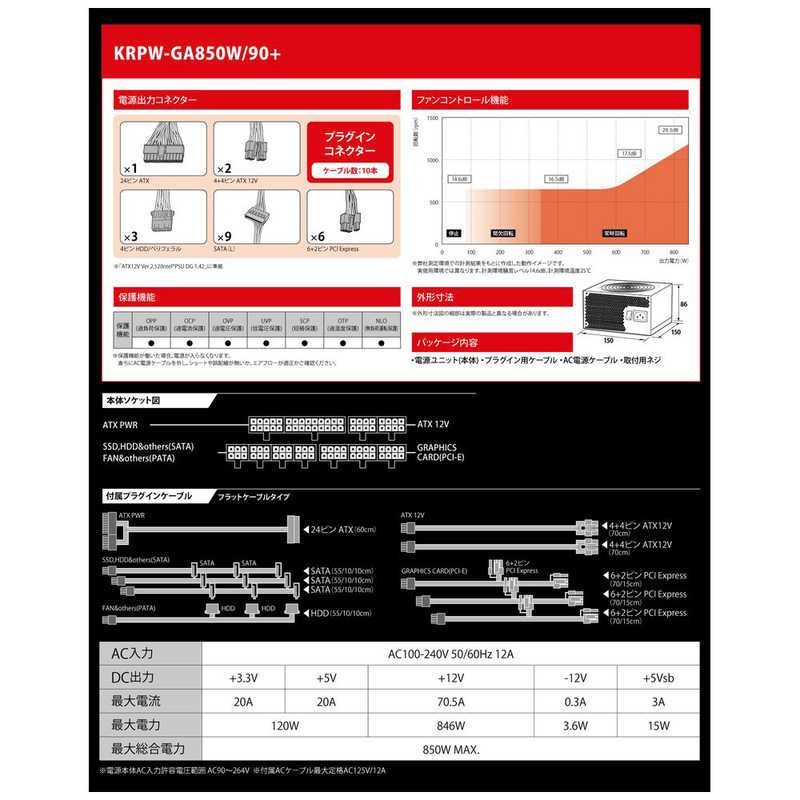 玄人志向 PC電源 ゲーミングPC向け 850 W ATX G ブラック KRPW-GA 90