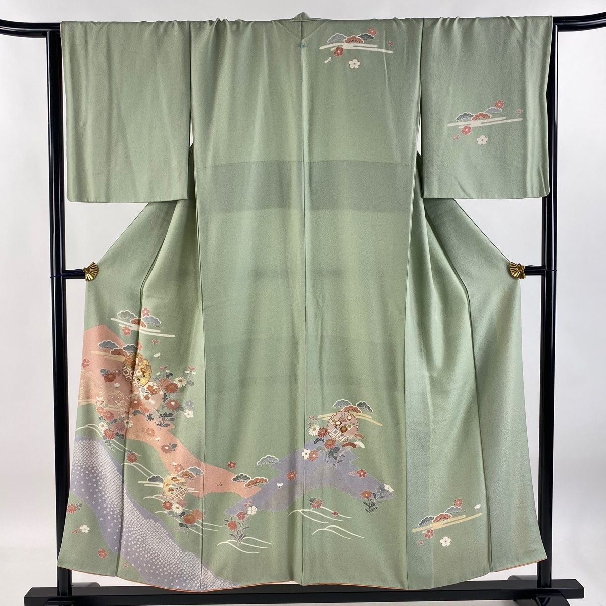 訪問着 身丈151.5 cm 裄丈66.5 M 袷 雪輪 菊 金彩 染め分け 薄緑 正絹 秀品 一つ紋
