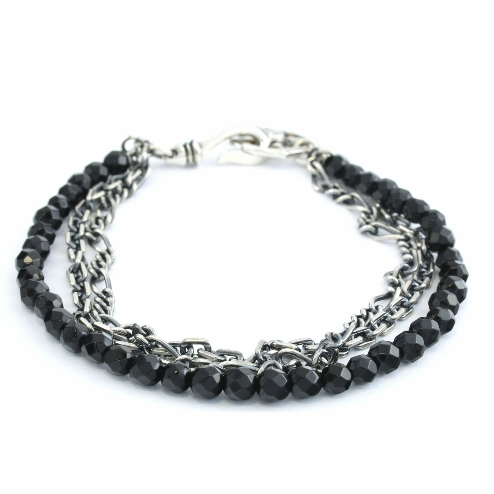 A study in contrasts, the Triple-Layered Bracelet fuses inky brilliance with sculptural metalwork. Faceted black spinel strands deliver a diamond-like sparkle, set against the tactile interplay of cable and curb chains for a layered silhouette that reads clean yet undeniably bold. The wrist-hugging, three-row construction creates rhythm and depth, slipping effortlessly into a modern wardrobe while making its presence known.