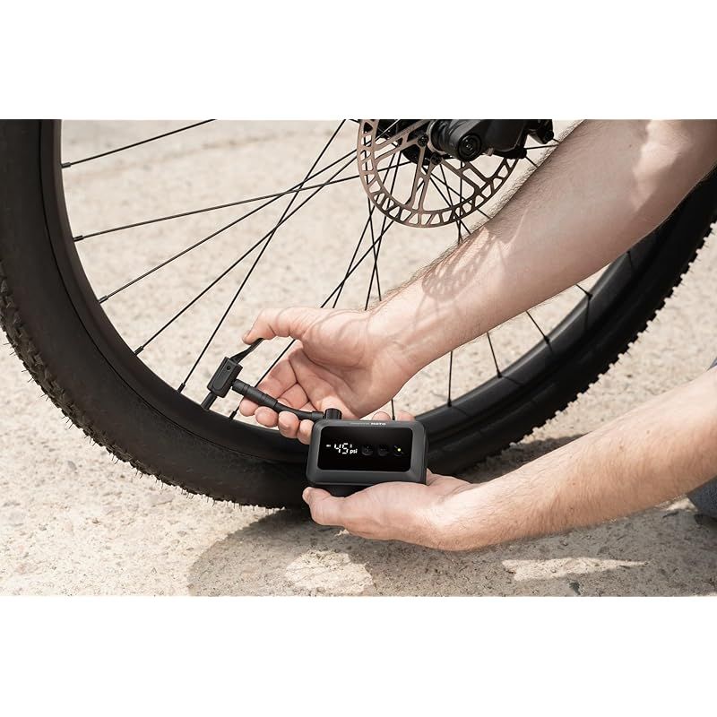 2,000mAhのリチウムイオンバッテリーを内蔵しています。最大8本の完全に空気が抜けた自転車のタイヤを膨らますことができ、空気圧が下がったタイヤなら18 本に空気を入れることができます。