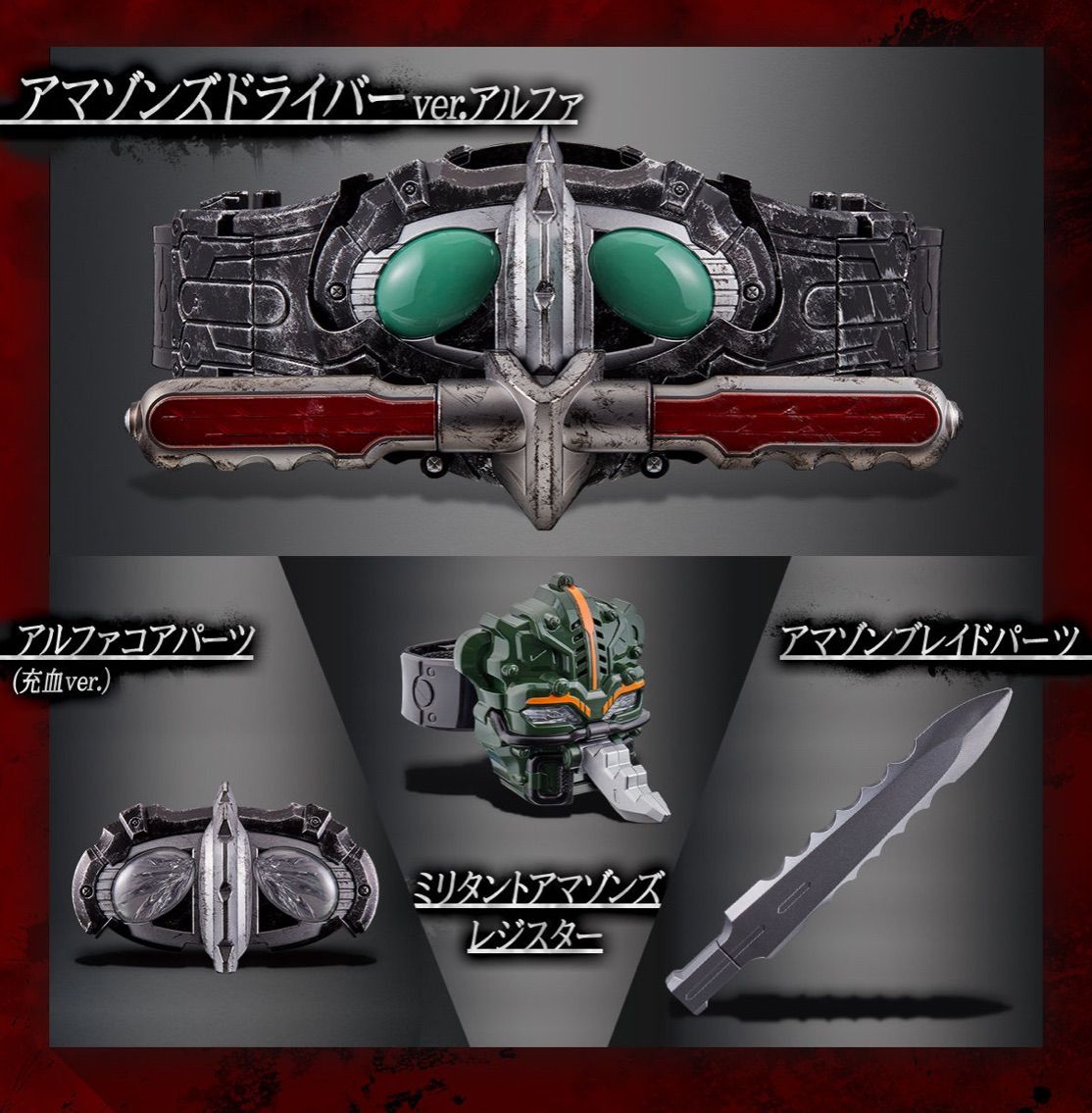 本商品は、『CSMアマゾンズドライバーver.アルファ』の他、劇中の充血発光演出を表現する『アルファコアパーツ(充血ver.)』、「仮面ライダーアマゾンズ THE MOVIE 最後ノ審判」に登場する「仮面ライダーアマゾンネオアルファ」の変身アイテム『ミリタントアマゾンズレジスター』、グリップと合体して武器になる『アマゾンブレイドパーツ』がセットになっています。