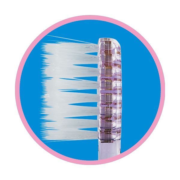 ●超先細毛(歯周ポケットに入り込んで汚れを落とす)+フラット毛(歯の表面に付いた汚れを落とす)。2種類の毛先の歯ブラシ。毛のかたさはふつうです。