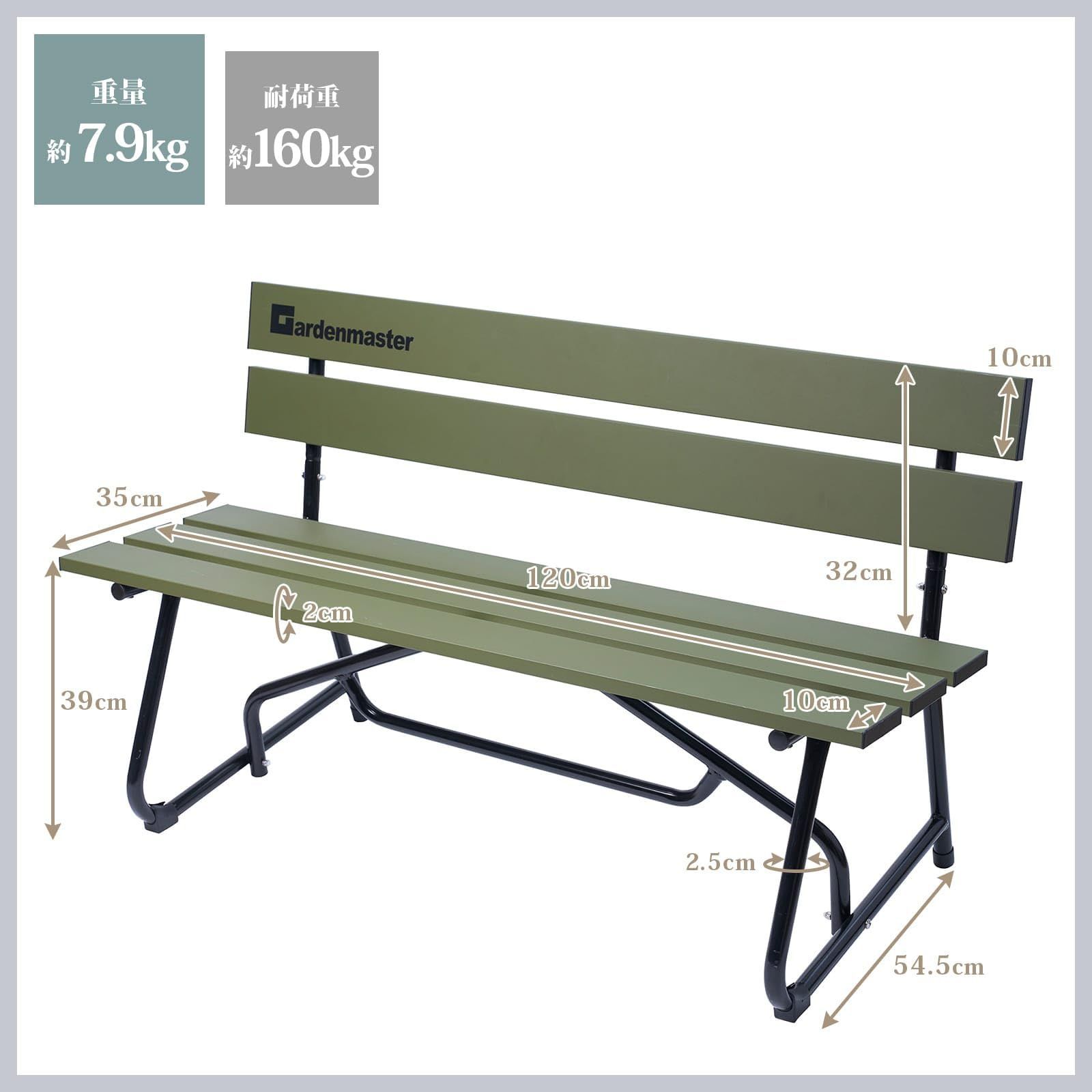 【仕様】サイズ:幅120×奥行53.5×高さ71cm/座面高さ:39cm/重量:約7.9㎏/耐荷重:約160kg/構造部材:アルミ/表面加工:ポリエステル塗装/カラー:オリーブ